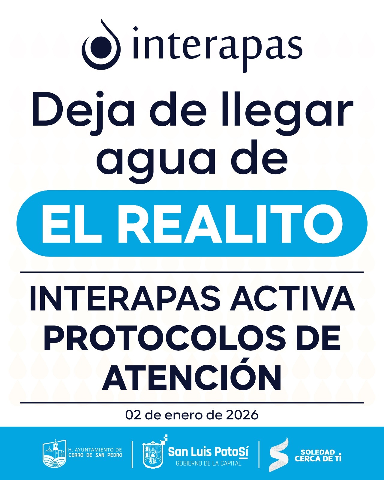 SLP.- La mañana de este viernes dejó de llegar agua proveniente de “El Realito” a los tanques de distribución de INTERAPAS, por lo que el organismo operador puso en marcha su protocolo de atención en la zona afectada.