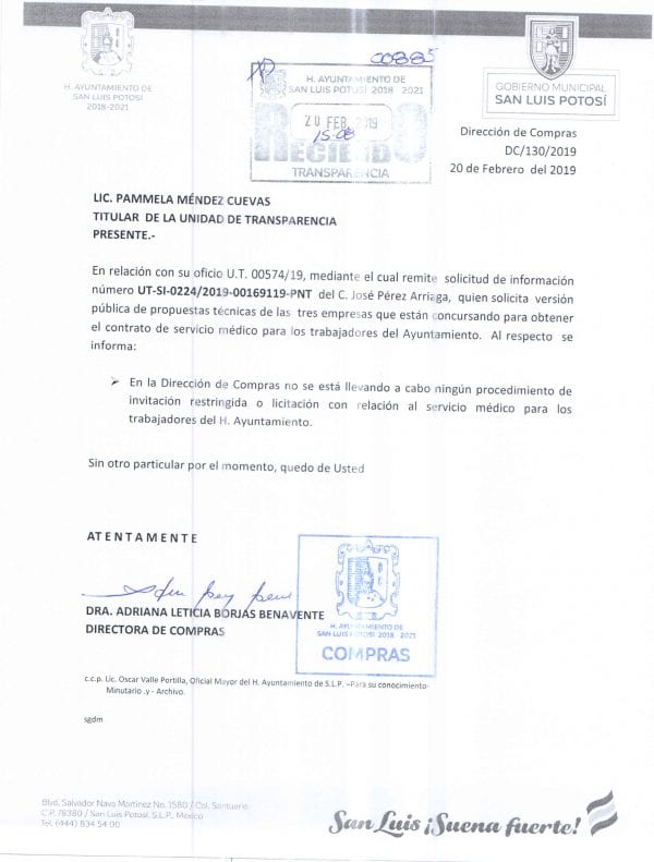 Según consta en la solicitud de información UT-SI-0224/2019-00169119-PNT respondida por la Dirección de Compras, hasta el 20 de febrero de 2019 no se había ejecutado ninguna licitación “con relación al servicio médico para los trabajadores del H. Ayuntamiento”.