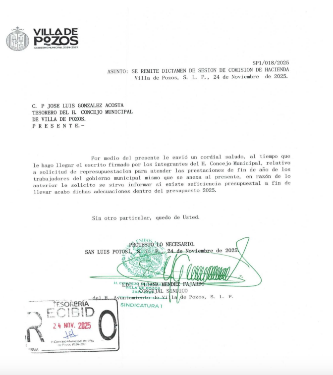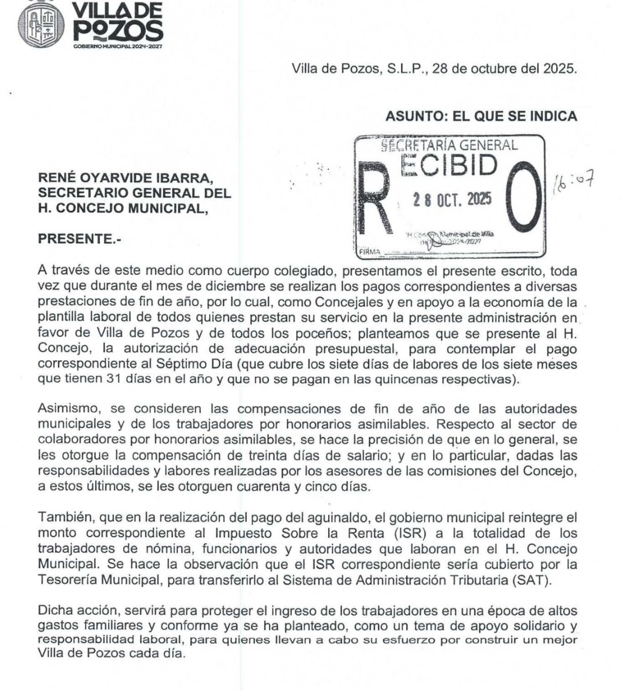 La Comisión de Hacienda del recién creado municipio de Villa de Pozos aprobó una adecuación presupuestal que permitirá entregar prestaciones de fin de año extraordinarias a todos los trabajadores municipales, incluidos los 12 concejales, quienes recibirán un paquete que supera los 200 mil pesos por persona.
