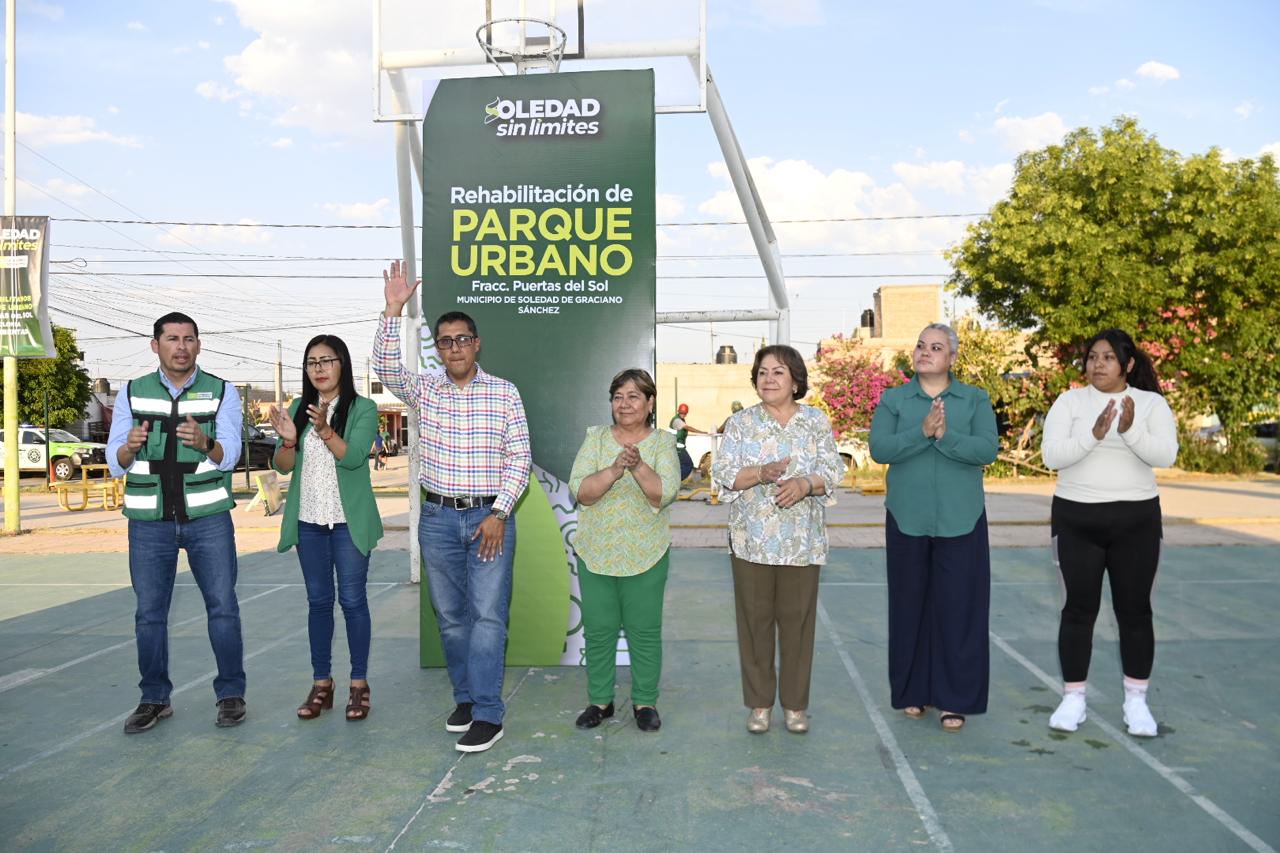 Juan Manuel Navarro Muñiz, alcalde de Soledad de Graciano Sánchez, impulsa la generación de más espacios públicos multifuncionales para el disfrute de las familias y el esparcimiento positivo de jóvenes e infantes, y este lunes, instruyó el arranque de la reconstrucción del Parque Urbano en la colonia “Puertas del Sol”, al oriente del municipio, un proyecto que beneficiará a más de 4 mil 500 habitantes y que fortalece la cercanía del Gobierno municipal, al atender anhelos históricos para el mejoramiento urbano y la interacción de las personas de todas las edades.