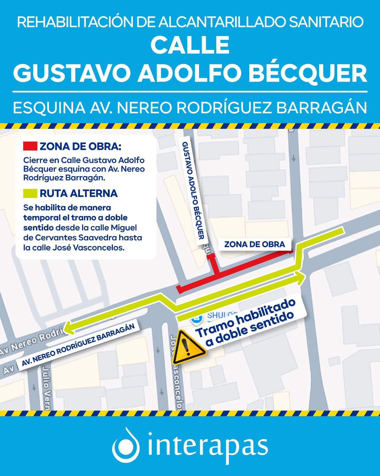Interapas inició el año, con trabajo continúo de atención a colapsos de drenaje, por lo que comenzó la rehabilitación de sanitaria en la calle Gustavo Adolfo Bécquer, esquina con avenida Nereo Rodríguez Barragán, colonia Del V alle; lo que implica cierres temporales a la circulación sobre la avenida.