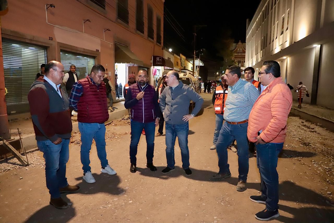 El alcalde de San Luis Potosí, Enrique Galindo Ceballos, realizó una supervisión nocturna para constatar el progreso de la obra de regeneración integral en la calle Julián de los Reyes, una de las más representativas del Centro Histórico.