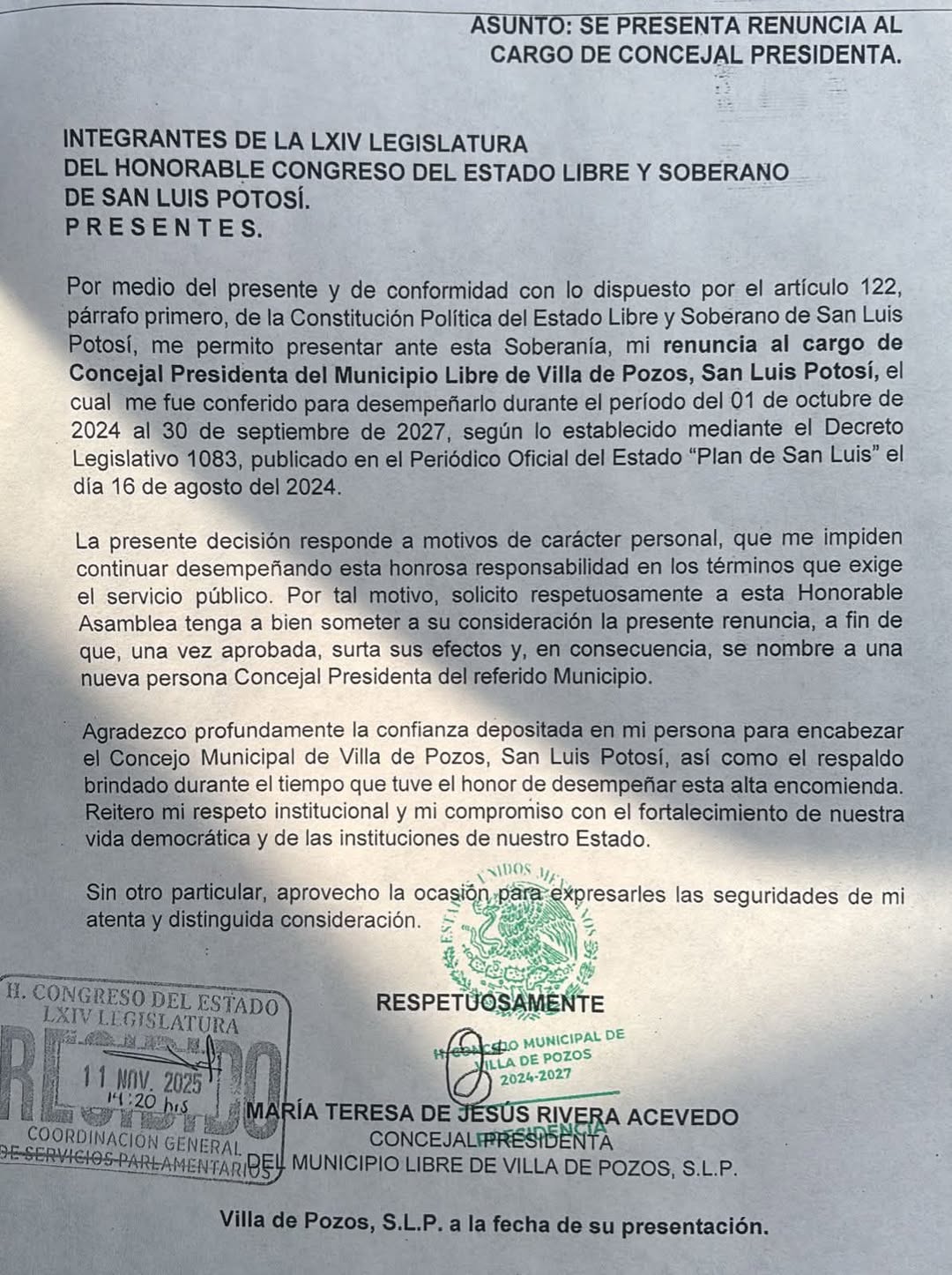 María Teresa de Jesús Rivera Acevedo, Concejal Presidenta del recién creado Municipio de Villa de Pozos, presentó formalmente su renuncia al cargo. El oficio, dirigido al Congreso del Estado, fue recibido el pasado 11 de noviembre de 2025.