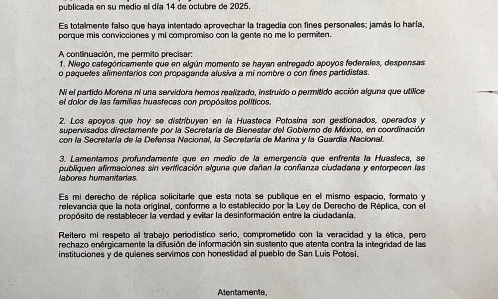 En ejercicio del derecho de réplica y conforme a la Ley Reglamentaria del artículo 6º constitucional, difundimos de manera íntegra el texto remitido por la ciudadana,...
