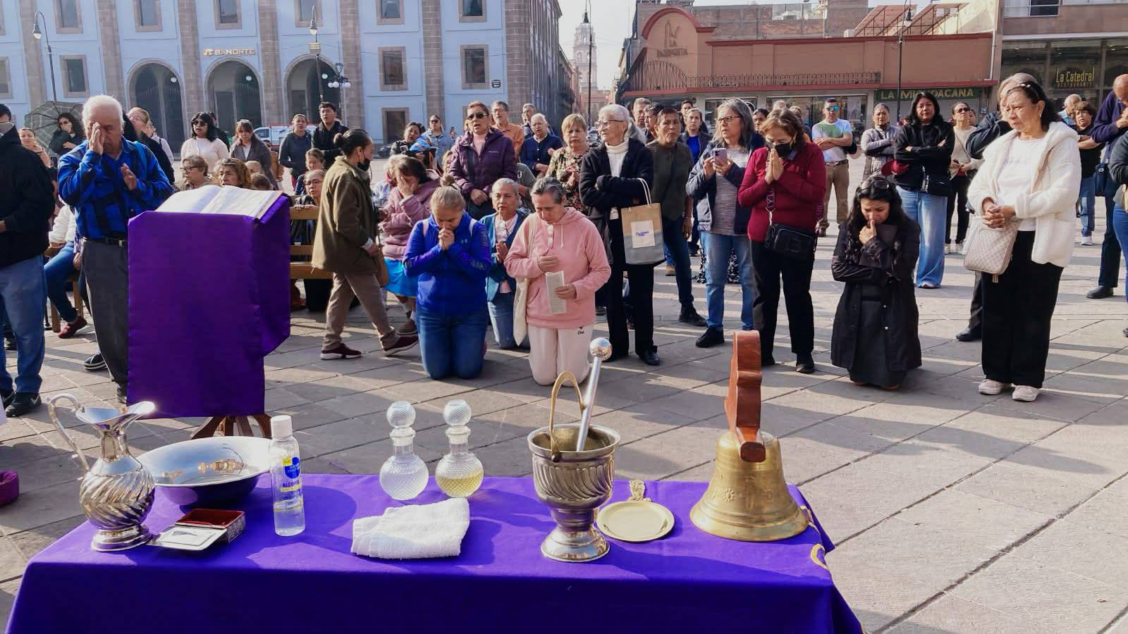 Debido a las afectaciones y a los posibles riesgos estructurales en el acceso principal, el párroco decidió oficiar la eucaristía en la explanada de Plaza de los Fundadores, donde fieles se congregaron para participar en la ceremonia religiosa.