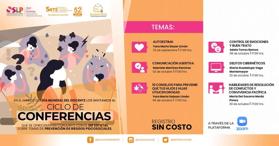 Con motivo del Día Mundial del Docente, los profesores pertenecientes a la Sección 52 del SNTE pidieron al DIF Estatal charlas con herramientas para fomentar el desarrollo integran de los estudiantes; dichas pláticas se llevarán a cabo vía Zoom y a través de la página oficial de facebook de la Sección 52 del SNTE, la primera se llevó a cabo el pasado viernes 25 de septiembre con el tema Autoestima y la última será el 30 de octubre. Cada una de las pláticas estará a cargo de personal de la Dirección de Bienestar Familiar de DIF Estatal.