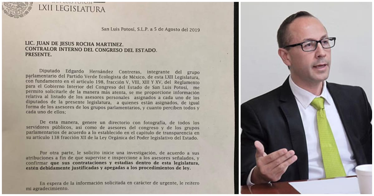 El diputado Edgardo Hernández solicitó un listado de los asesores contratados a la Contraloría Interna del Congreso del Estado de San Luis Potosí, para saber a qué congresistas están asignados y cuáles son sus percepciones.