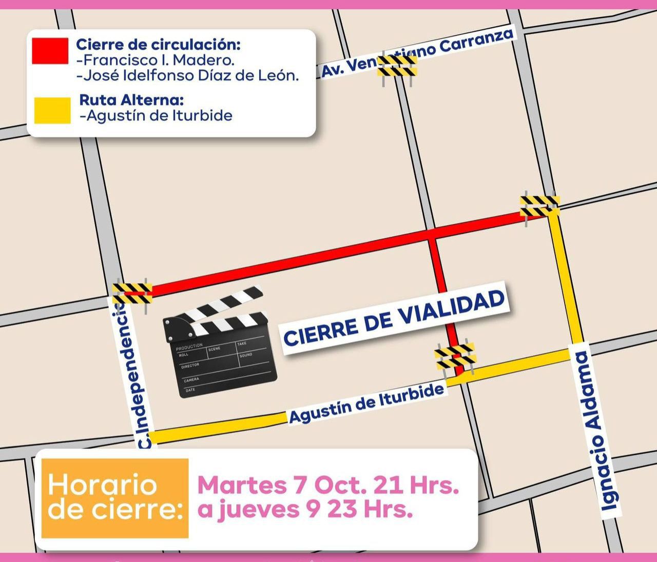 , periodo en el que se desarrollarán actividades de filmación en el centro de la ciudad.Se recomienda a la ciudadanía tomar precauciones y planear rutas alternas para evitar afectaciones en su traslado durante los días señalados.