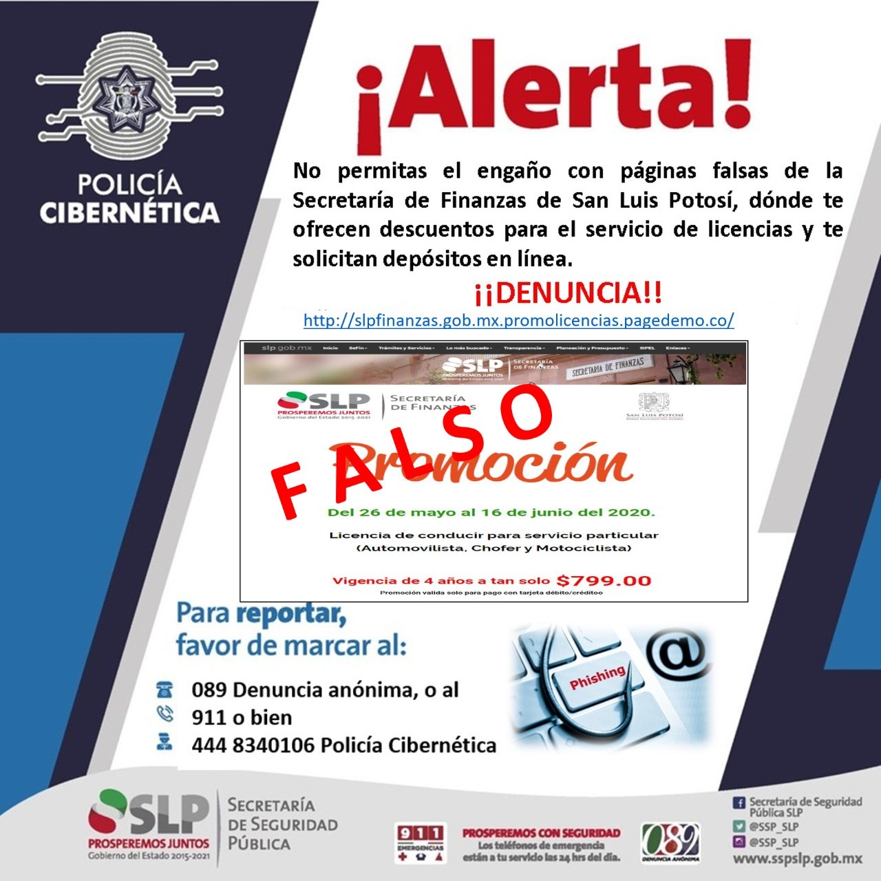 El funcionario estatal explicó que, a través de páginas de Facebook, así como de mensajes de Whatsapp, defraudadores hacen circular una imagen en donde ofrecen licencias de conducir para servicio particular en las modalidades de automovilista, chofer y motociclista , por 4 años a un costo de $799.00. dicha cantidad piden se pague en línea para lo que habilitaron la página falsa http://slpfinanzas.gob.mx.promolicencias.pagedemo.co/