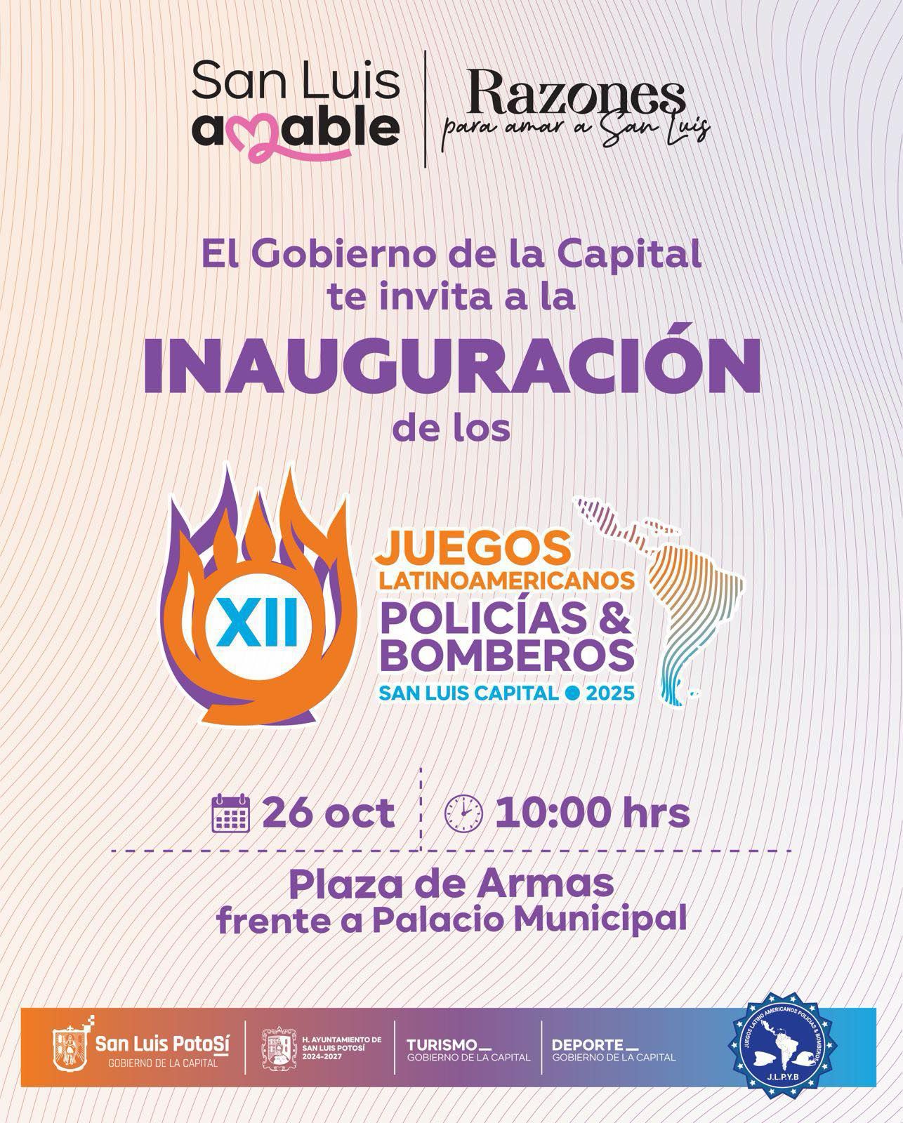 Este domingo 26 de octubre, San Luis Capital se engalanará para dar inicio a la XII edición de los Juegos Latinoamericanos de Policías y Bomberos. Hasta el 1 de noviembre, nuestra ciudad será el epicentro de la actividad deportiva, reuniendo a cerca de 3 mil competidores de 16 países: México, Brasil, Perú, Guatemala, Colombia, El Salvador, España, Bolivia, Nicaragua, Panamá, República Dominicana, Francia, Estados Unidos, Honduras, Pakistán e India, que sumarán su talento a este magno evento.