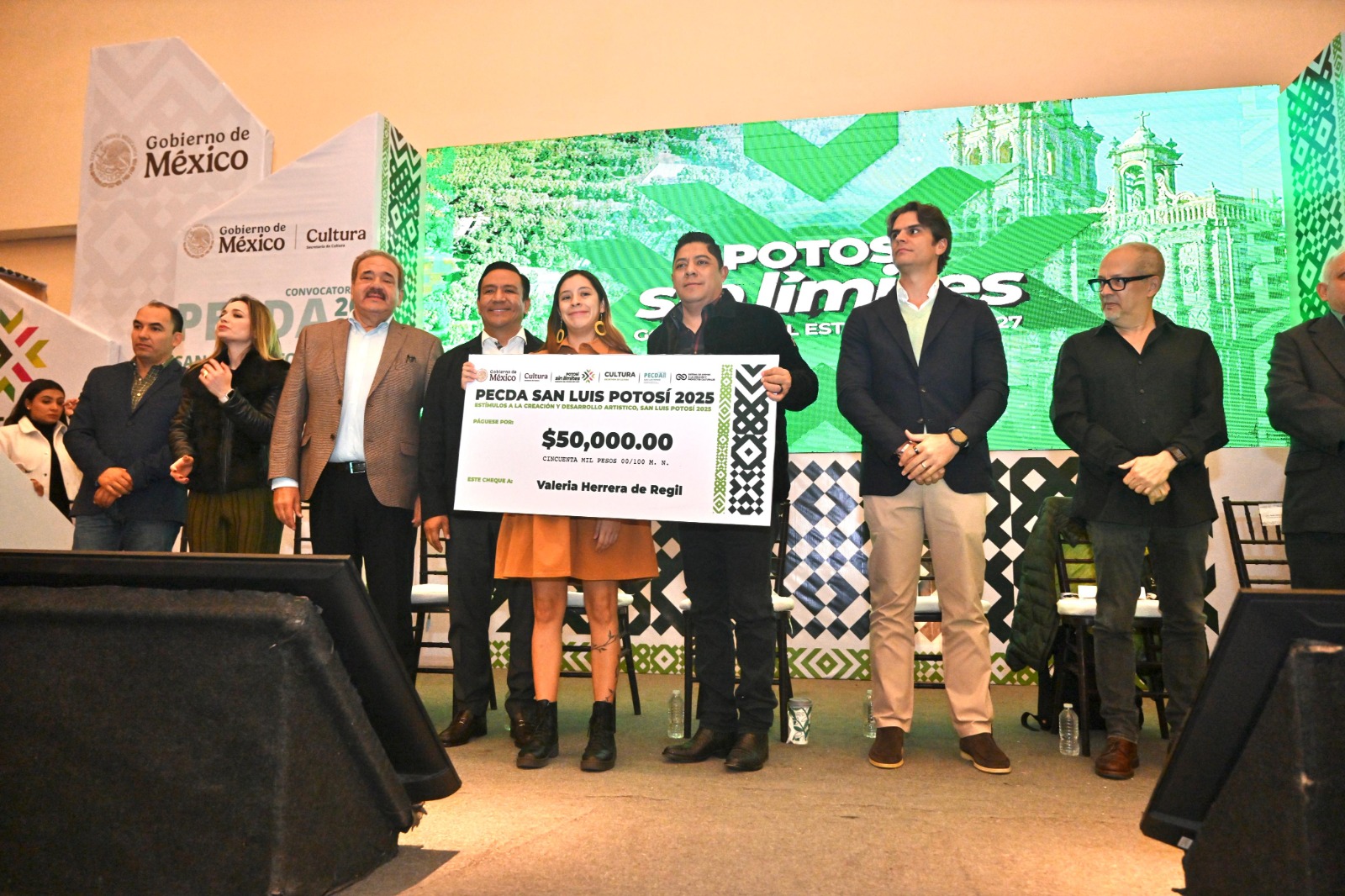 Al entregar los estímulos económicos y reconocimientos del Programa de Estímulos a la Creación y Desarrollo Artístico (PECDA) 2025, que este año aumentó el número de beneficiarios a 67 artistas con una inversión conjunta de 4 millones 150 mil pesos, el Gobernador de San Luis Potosí Ricardo Gallardo Cardona refrendó el compromiso de fortalecer el desarrollo artístico y cultural en el Estado.