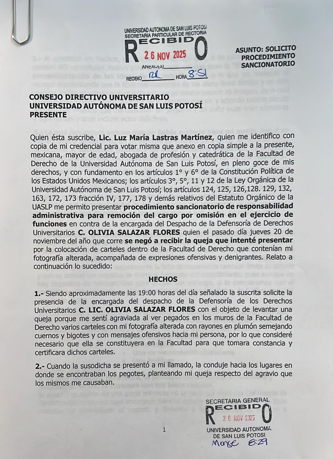 Luz María Lastras Martínez, catedrática de la Facultad de Derecho de la Universidad Autónoma de San Luis Potosí (UASLP), solicitó formalmente la destitución de la encargada del despacho de la Defensoría de Derechos Universitarios, Olivia Salazar Flores, a quien acusa de omisión en el ejercicio de sus funciones al negarse a recibir una queja por agresiones en su contra.