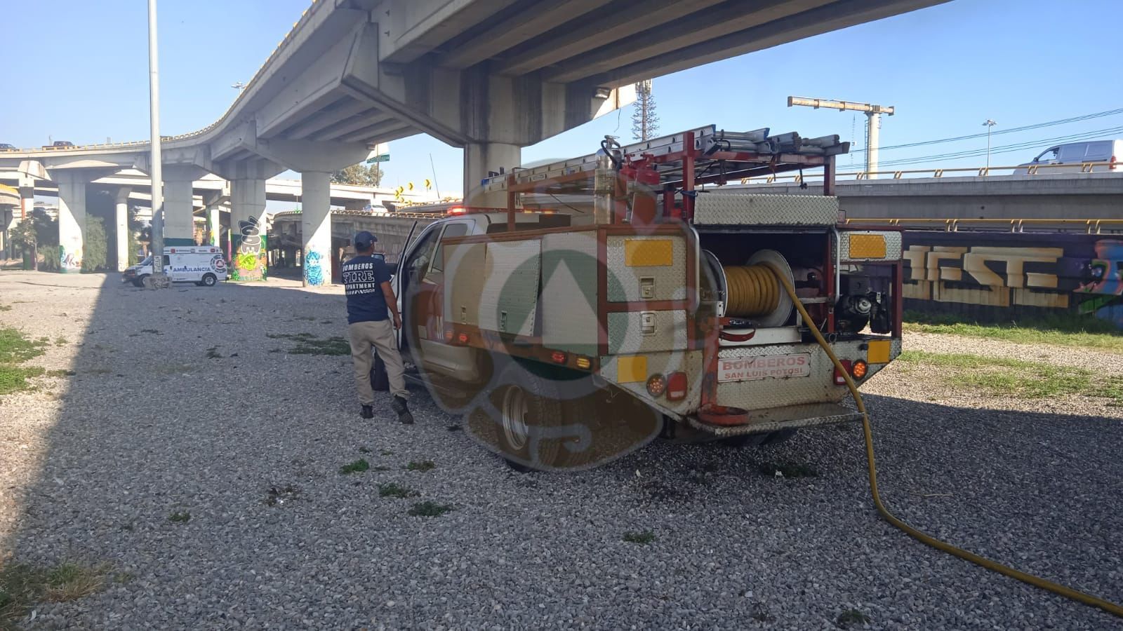 Elementos de la Dirección de Protección Civil Municipal atendieron esta mañana de miércoles un reporte de conato de incendio en la parte baja del distribuidor vial Juárez, en la capital potosina.