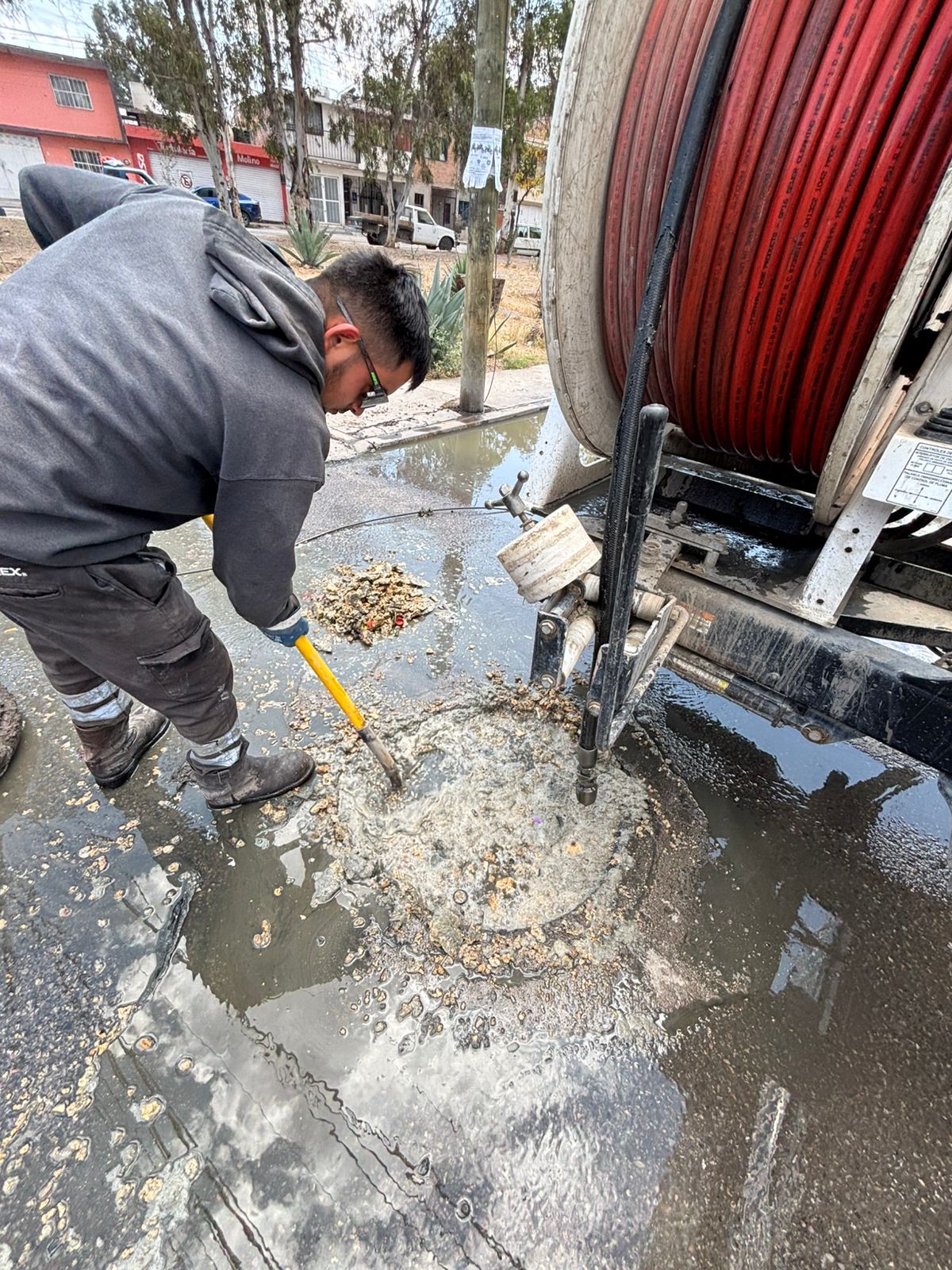 El primero se ubica en avenida Papagayos, al norte de la ciudad, donde se realizó una limpieza profunda en la red de drenaje. En este punto se sondearon 280 metros lineales a través de seis pozos de visita, de donde se extrajeron aproximadamente 120 kilogramos de grasa y basura, acumulación que había provocado una fuga de aguas residuales. Tras la intervención, el sistema quedó funcionando de manera adecuada y el flujo fue restablecido.
