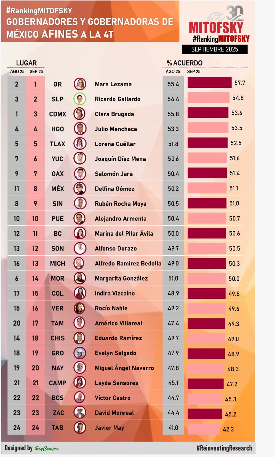 El posicionamiento de Gallardo destaca notablemente al superar a figuras de estados clave como el Estado de México (Delfina Gómez, #8) y Sinaloa (Rocha, #9). Este resultado se da en un contexto donde la coalición gobernante administra 24 de las 32 entidades del país. En contraste con la alta aprobación del potosino, el ranking de los mandatarios afines a la 4T cierra con las evaluaciones más bajas, ocupadas por David Monreal (Zacatecas, #23) y Javier May (Tabasco, #24).