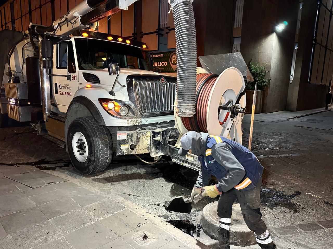 Estas acciones forman parte de la limpieza preventiva y las jornadas nocturnas de desazolve que realiza INTERAPAS para mantener en condiciones óptimas la red sanitaria durante las actividades en el Centro Histórico en Semana Santa y Pascua.