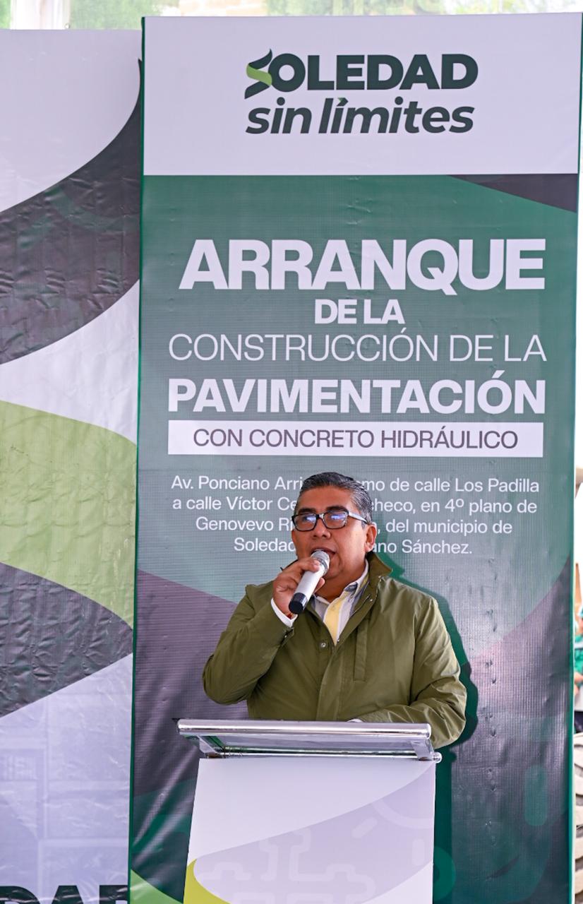 Juan Manuel Navarro Muñiz, alcalde de Soledad de Graciano Sánchez, encabezó el arranque de la obra de pavimentación con concreto hidráulico y sistema de alumbrado público de la avenida Ponciano Arriaga, en el tramo que va de calle Los Padilla a calle Víctor Cervera Pacheco, con una inversión superior a los 23.5 millones de pesos, beneficiando directamente a casi 6 mil habitantes; este proyecto forma parte del compromiso permanente del Gobierno Municipal por mejorar la infraestructura urbana y elevar la calidad de vida de las familias.