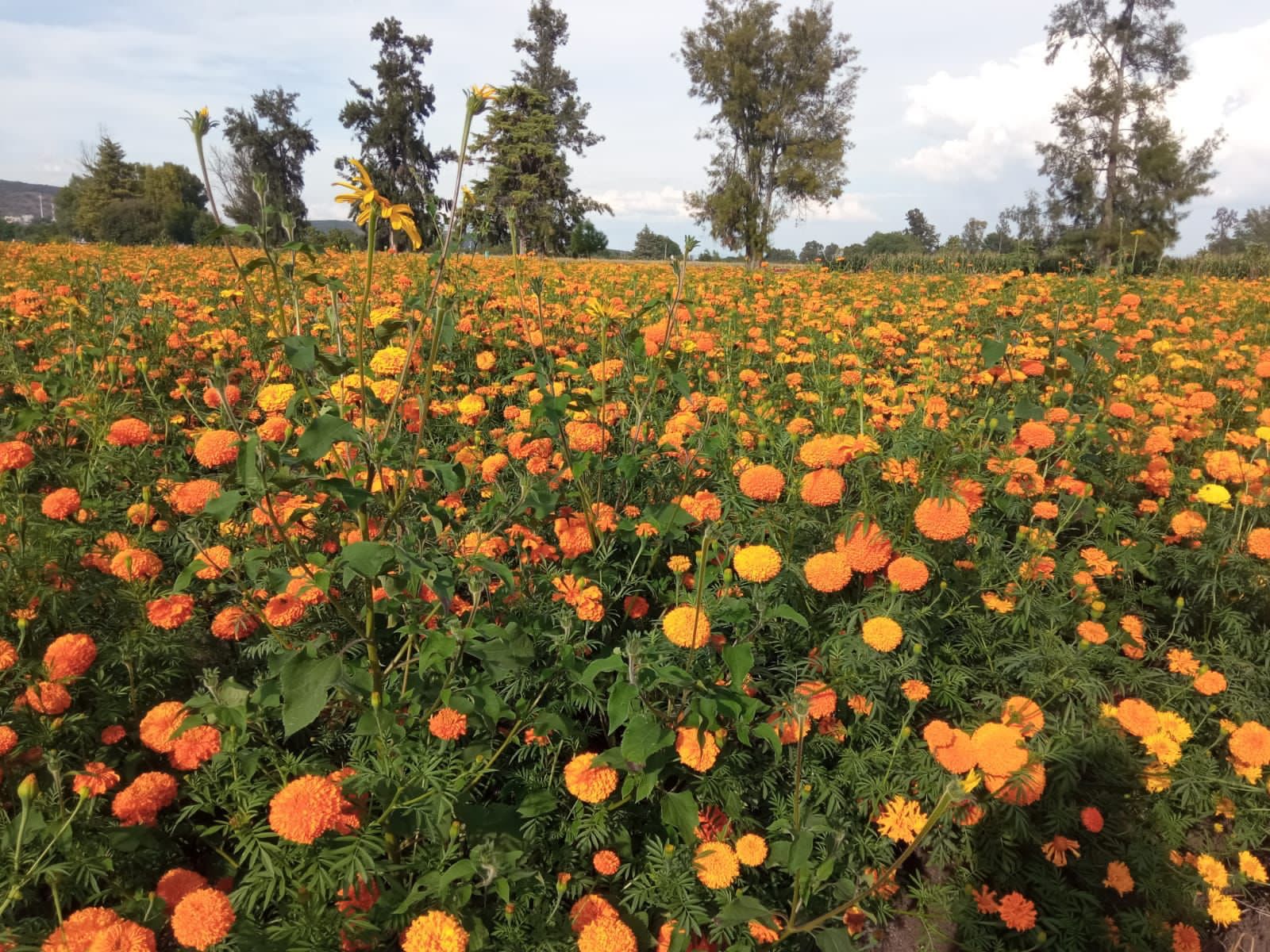 En los campos de cultivo de Soledad de Graciano Sánchez se avanza a la etapa final de floración de las hectáreas dedicadas al cultivo de cempasúchil. Estas flores serán ofrecidas para quienes preparan altares u ofrendas para el día de muertos.