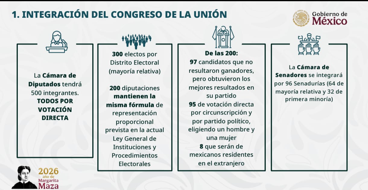 El documento establece una nueva integración del Congreso de la Unión. La Cámara de Diputados se mantendrá en 500 integrantes, todos por votación directa: 300 por mayoría relativa en distritos electorales y 200 bajo la fórmula de representación proporcional prevista en la Ley General de Instituciones y Procedimientos Electorales. De estas 200 diputaciones, 97 corresponderán a candidatos que no resultaron ganadores pero obtuvieron los mejores resultados en su partido; 95 serán electas por circunscripción y por partido político, eligiendo un hombre y una mujer; y 8 serán para mexicanos residentes en el extranjero. La Cámara de Senadores se integrará por 96 senadurías: 64 de mayoría relativa y 32 de primera minoría.