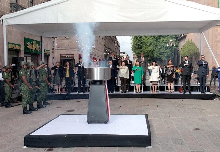 Mendoza Díaz colocó la bandera en el incinerador, para proceder con la ceremonia; y posteriormente, con el nuevo lábaro patrio, se llevó a cabo el izamiento en el edificio recinto del Poder Legislativo.