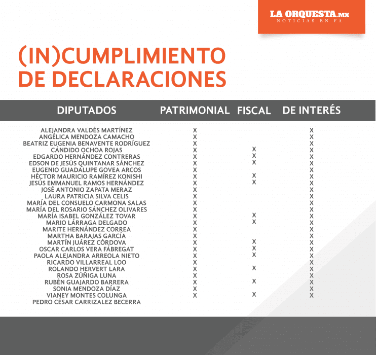 Cabe señalar también que los 26 diputados que presentaron su declaración patrimonial, también presentaron su declaración de intereses; sin embargo, solo 13 entregaron la correspondiente a su situación fiscal, aunque en ninguna de las mencionadas anteriormente se puede visualizar el detalle de los datos.