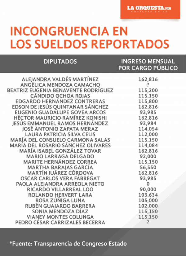 Por otro lado, al indagar en los sueldos que recibe cada uno de los congresistas, se puede constatar que las cantidades difieren, pese a que todos cobran el mismo sueldo; e incluso hay quien, según su declaración, no recibe sueldo alguno, mientras que otros aseguran solo ganar alrededor 56 mil pesos. Más aún, ciertos legisladores reportan cobrar cada mes hasta 162 mil pesos.