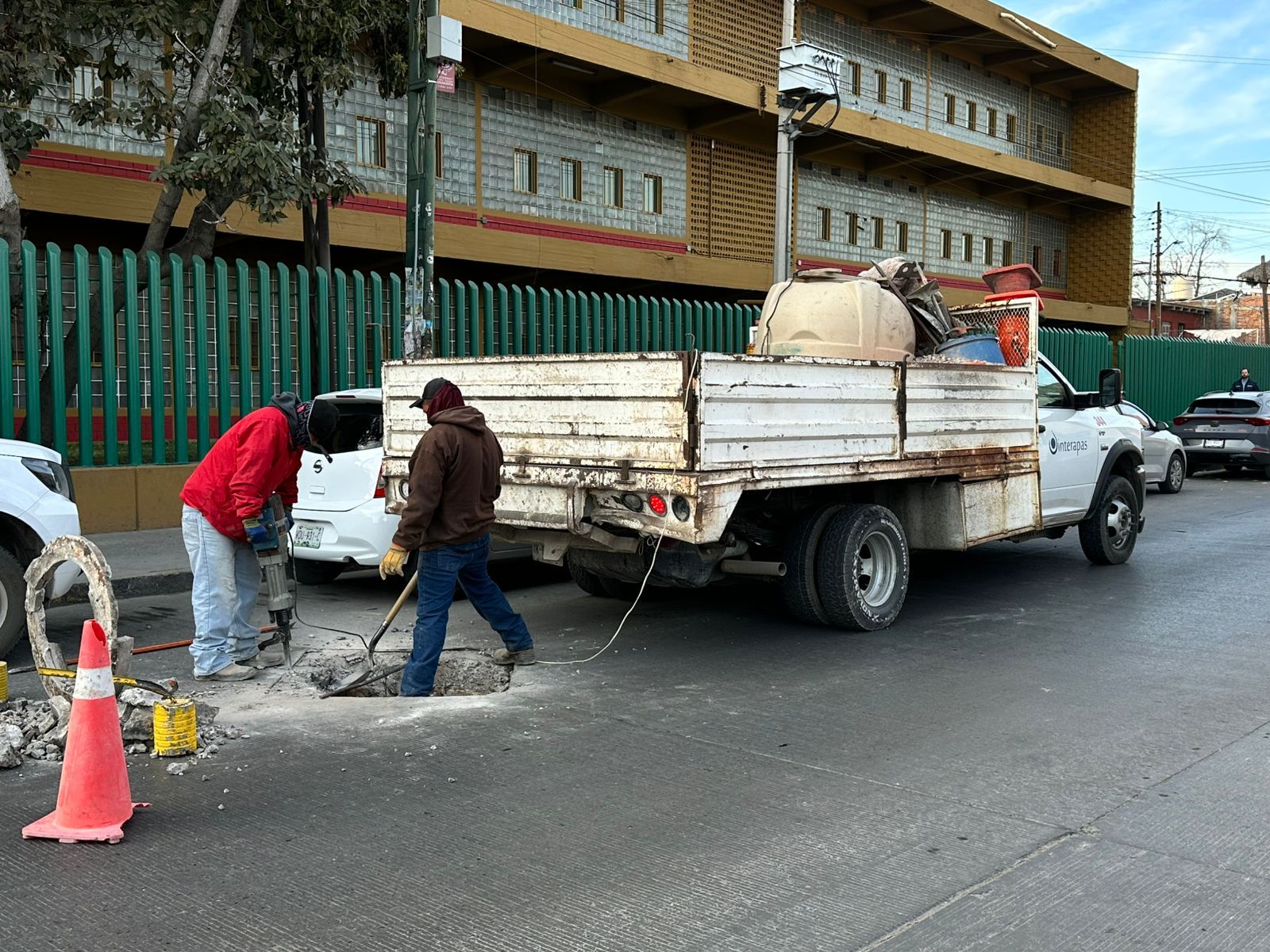 Personal del área de bacheo de Interpas, realizó la reposición de la tapa y el brocal de un pozo de visita de la red sanitaria, ubicado en la calle Manuel José Othón esquina con Calle Tercera en la colonia San Antonio, frente a un centro esco lar.