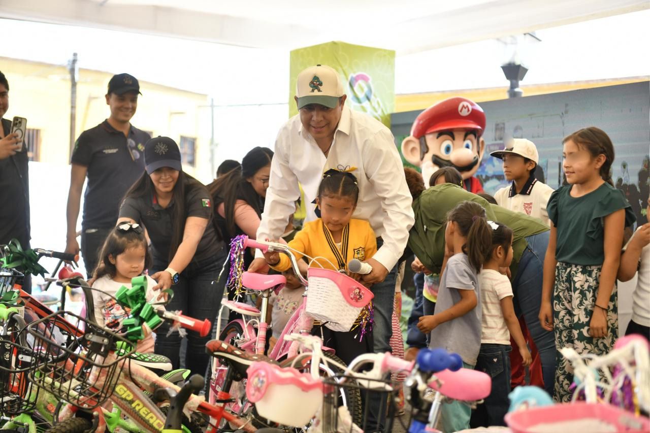 En un evento celebrado en la plaza principal, el Gobernador del Estado entregó bicicletas, balones y juguetes a niños y niñas de diferentes comunidades del municipio