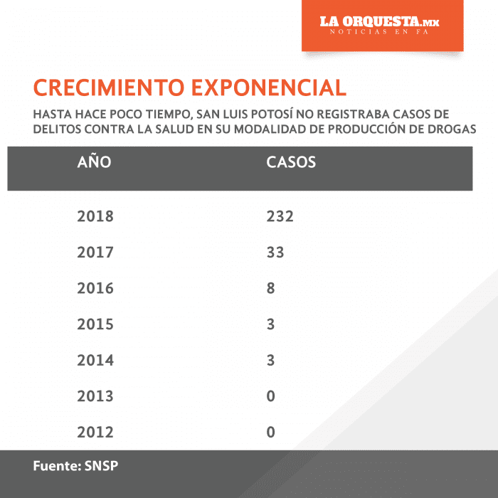 Hasta entonces, 2017 había sido el año récord en el número de delitos contra la salud en la modalidad de producción de drogas en San Luis Potosí. En 2016 el número había sido de ocho, en 2014 y 2015, de tres cada mes; y de cero en 2012 y 2013.
