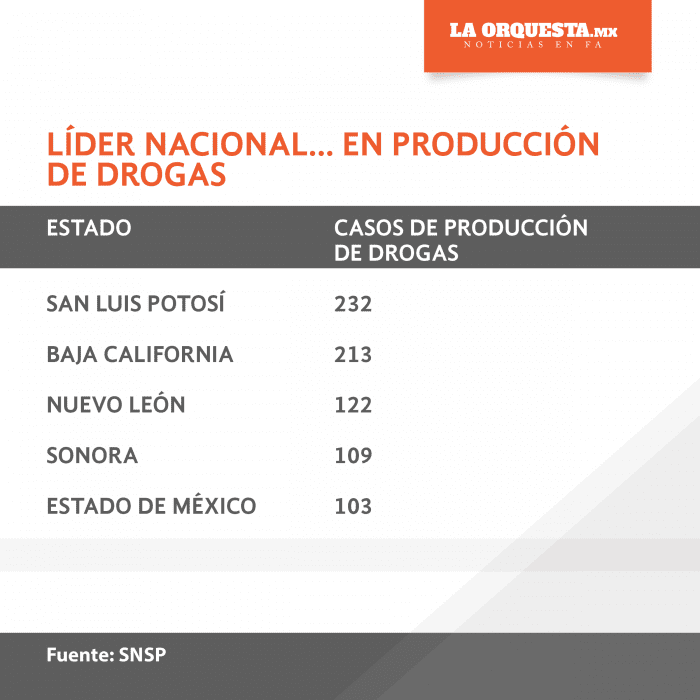 Durante el año pasado, el SNSP registró en el estado de San Luis Potosí 232 casos de delitos contra la salud en la modalidad de producción de drogas, superando a todos los demás estados del país. El único que estuvo cerca de esas cifras fue Baja California, que tuvo 213 casos.