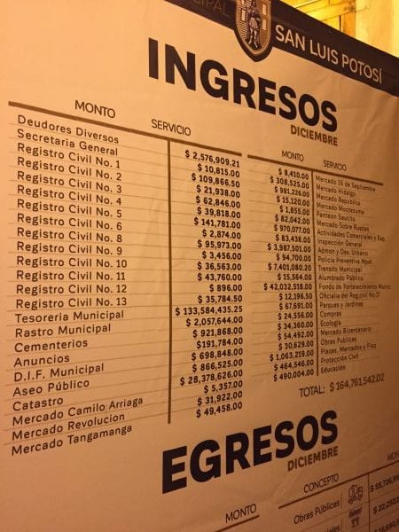 Mientras que los desplegados que el Ayuntamiento de San Luis Potosí colocó en Palacio Municipal reportan ingresos por 228 millones 193 mil 497.16 pesos, los documentos que publica la Cegaip, con datos proporcionados por el municipio, muestran que durante el mes de diciembre, la administración de Xavier Nava recibió recursos por 975 millones 696 mil pesos.
