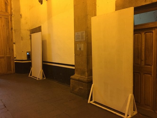 Además, cuando LaOrquesta.MX visitó Palacio Municipal para consultar las lonas, las mamparas que las contienen estaban pegadas a la pared, por lo que estaban prácticamente invisibles al público en general.
